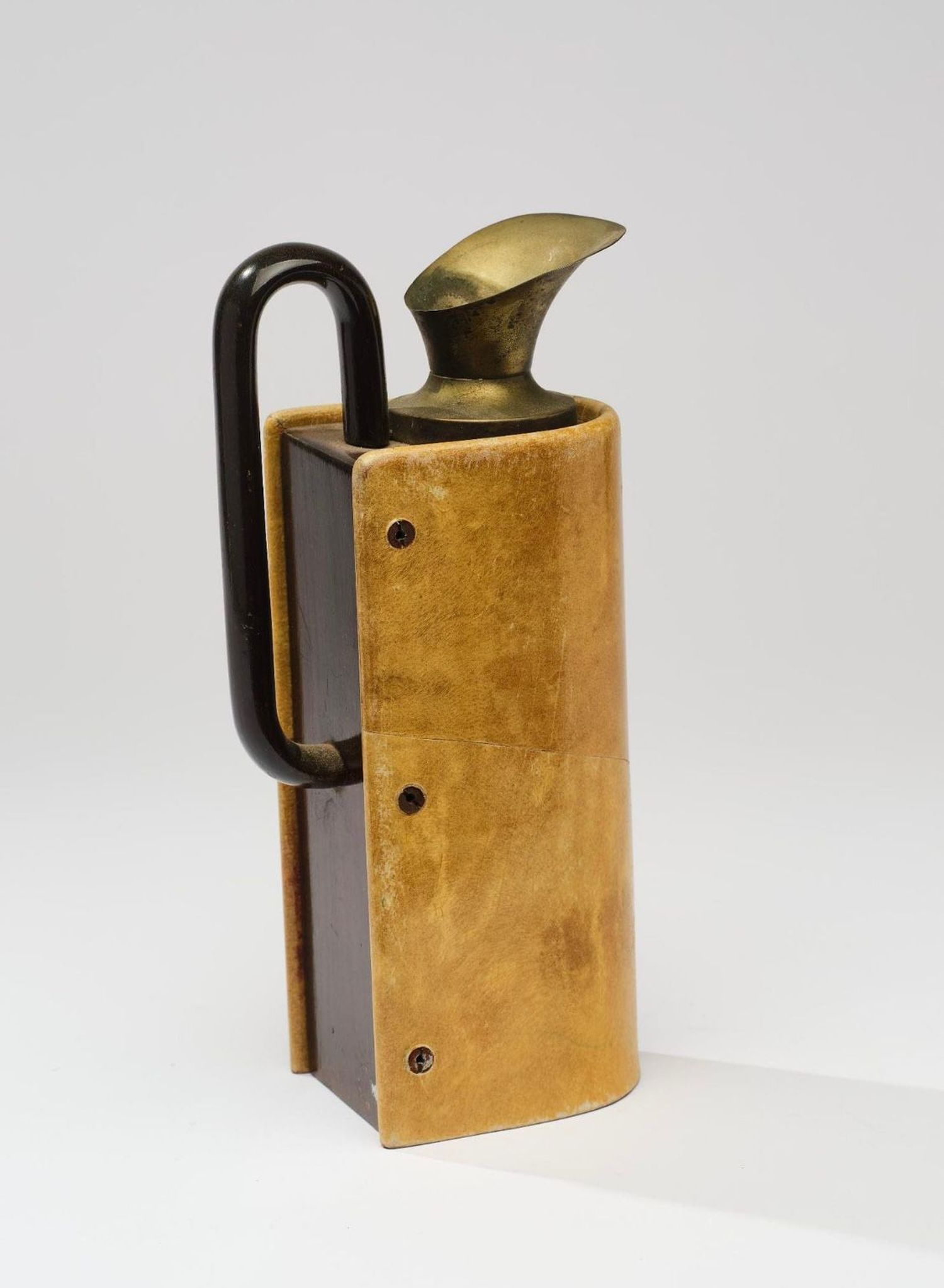 Modernist-form coffee pot with a wooden structure and rosewood veneer to the underside and handle. The body is clad in parchment, with a pewter spout. Publisher’s stamp to the underside.